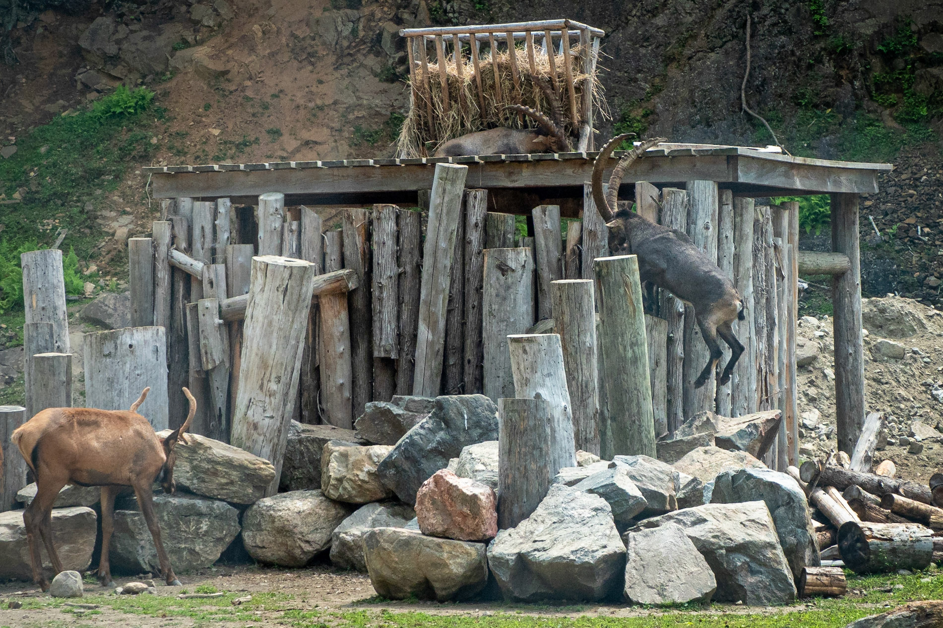 Arctic and black wolves relaxed while the alpine ibex climbed to the top to have lunch.