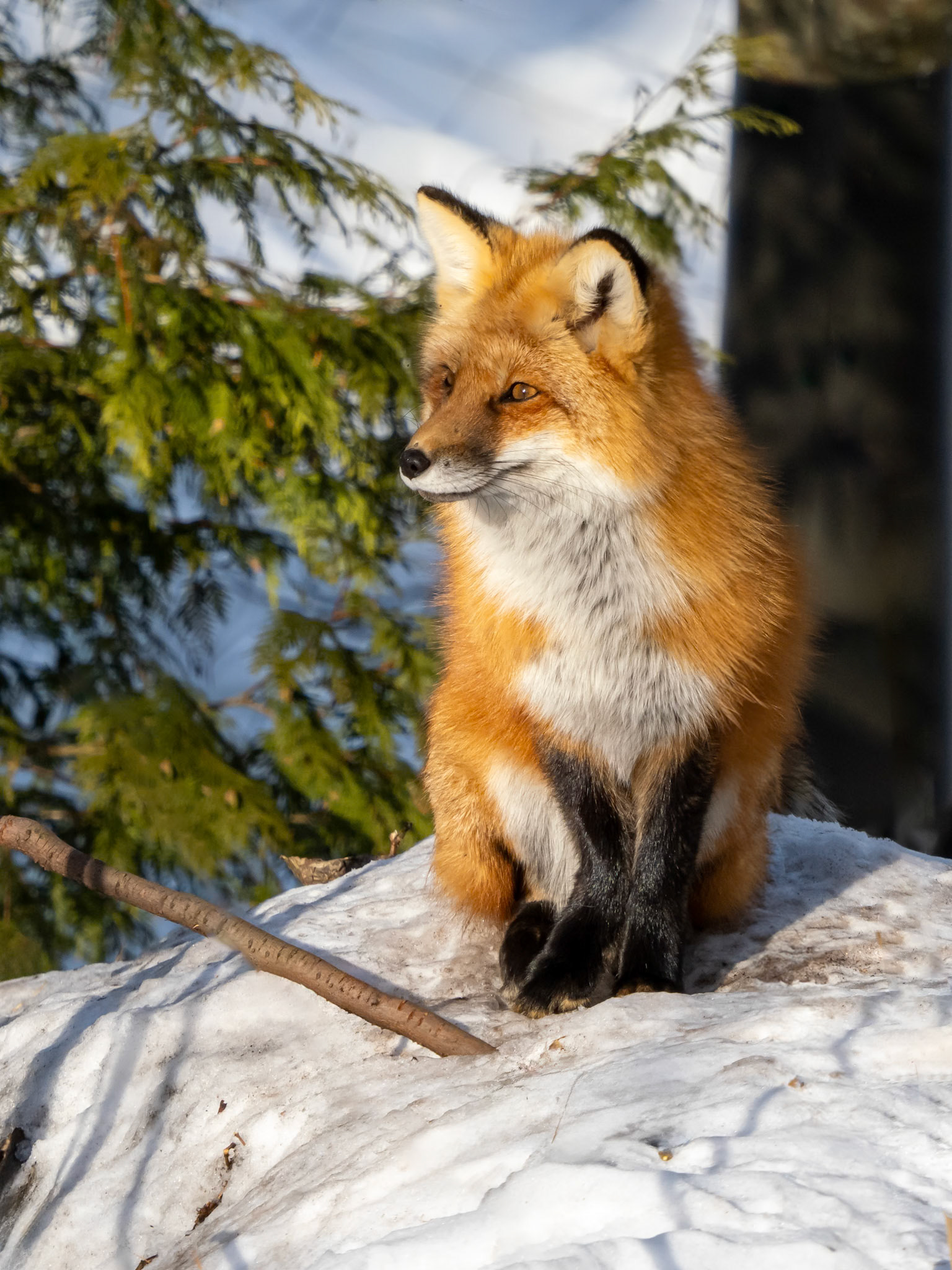 The red fox at the Parc Omega office/store/restaurant really caught my eye with it sitting in the bright sunshine. The silver fox, in the same enclosure, was resting on the raised platform close to the patio. I was told they had been training the silver fox to be more in evidence to visitors, rather than hiding as it had been doing.