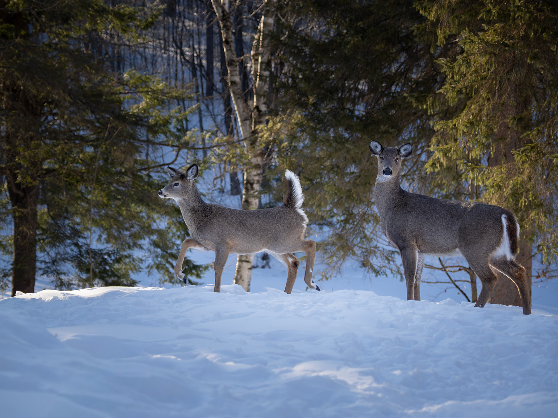 I visited a friend out Almonte way who had been having deer come to his (extensive) backyard regularly almost at fixed times. The day I was there, the deer arrived and left early , but I managed one nice photo of two deer.