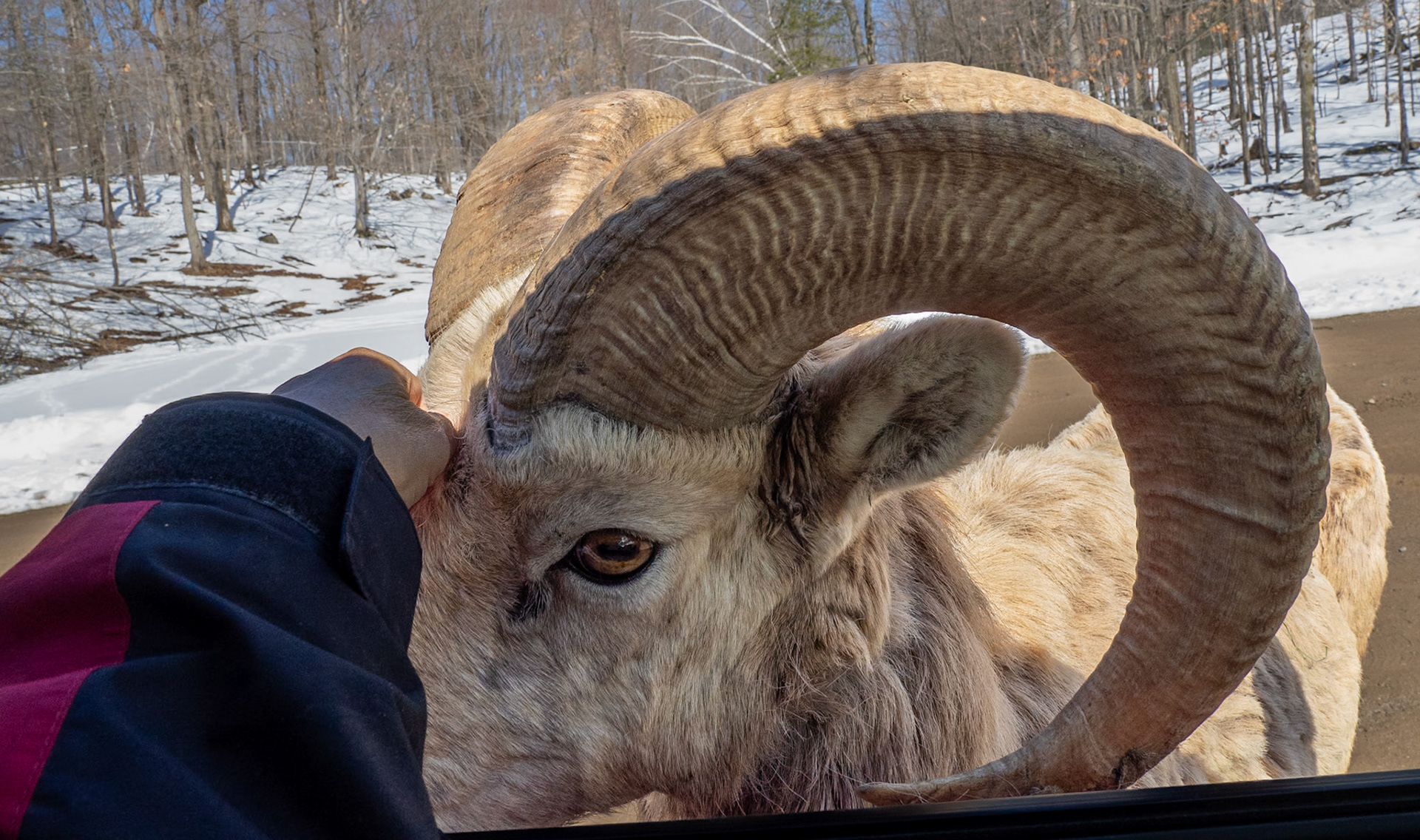 I've had elk at Parc Omega enjoy a good skritch, but this month we had a bighorn sheep that once I started to providing a skritch, he insisted (by banging the car door with his horn) on more - under chin, behind ear, forehead....
