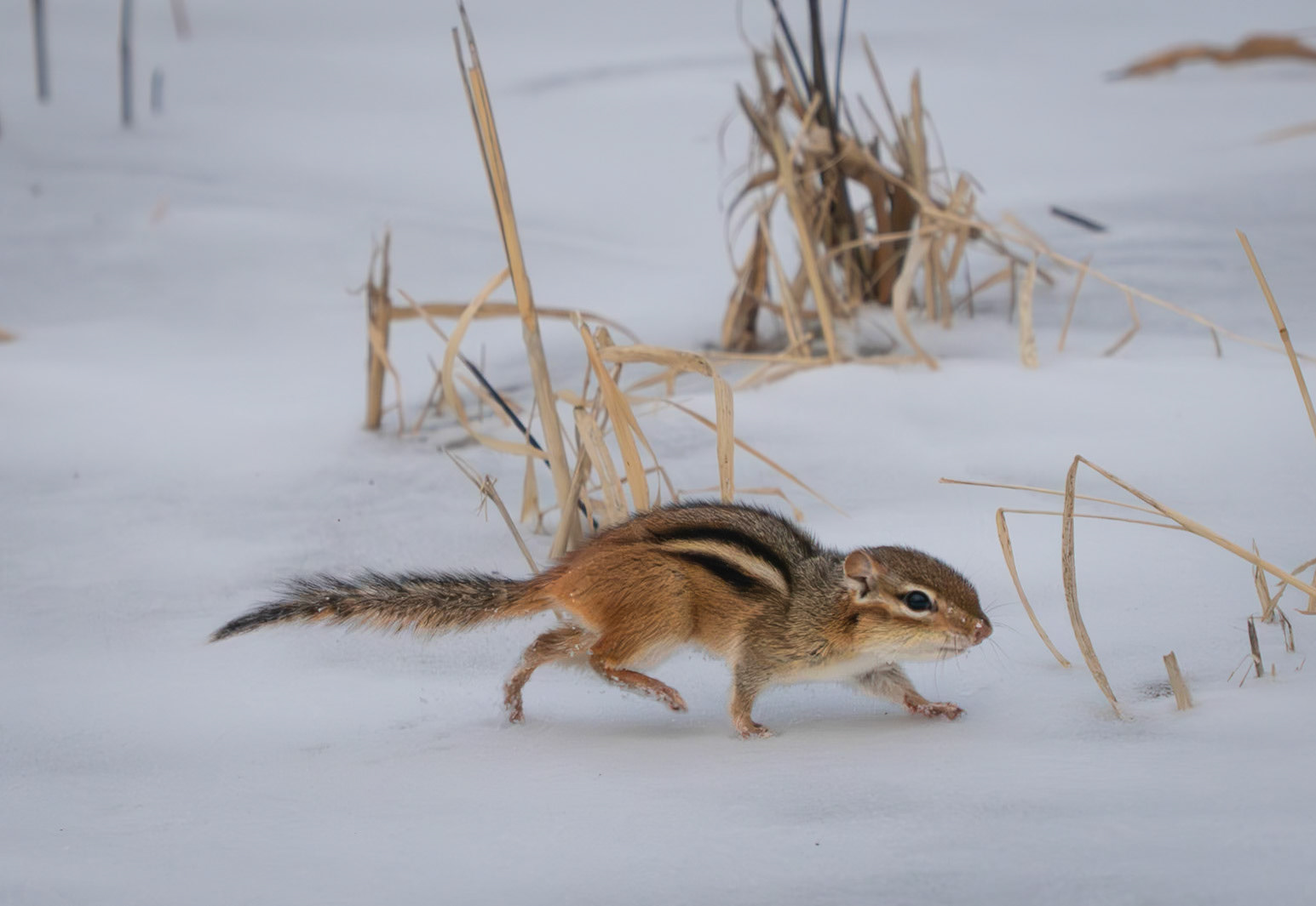 A very thin looking chipmunk out in the snow in January - a very sorry looking eye catcher