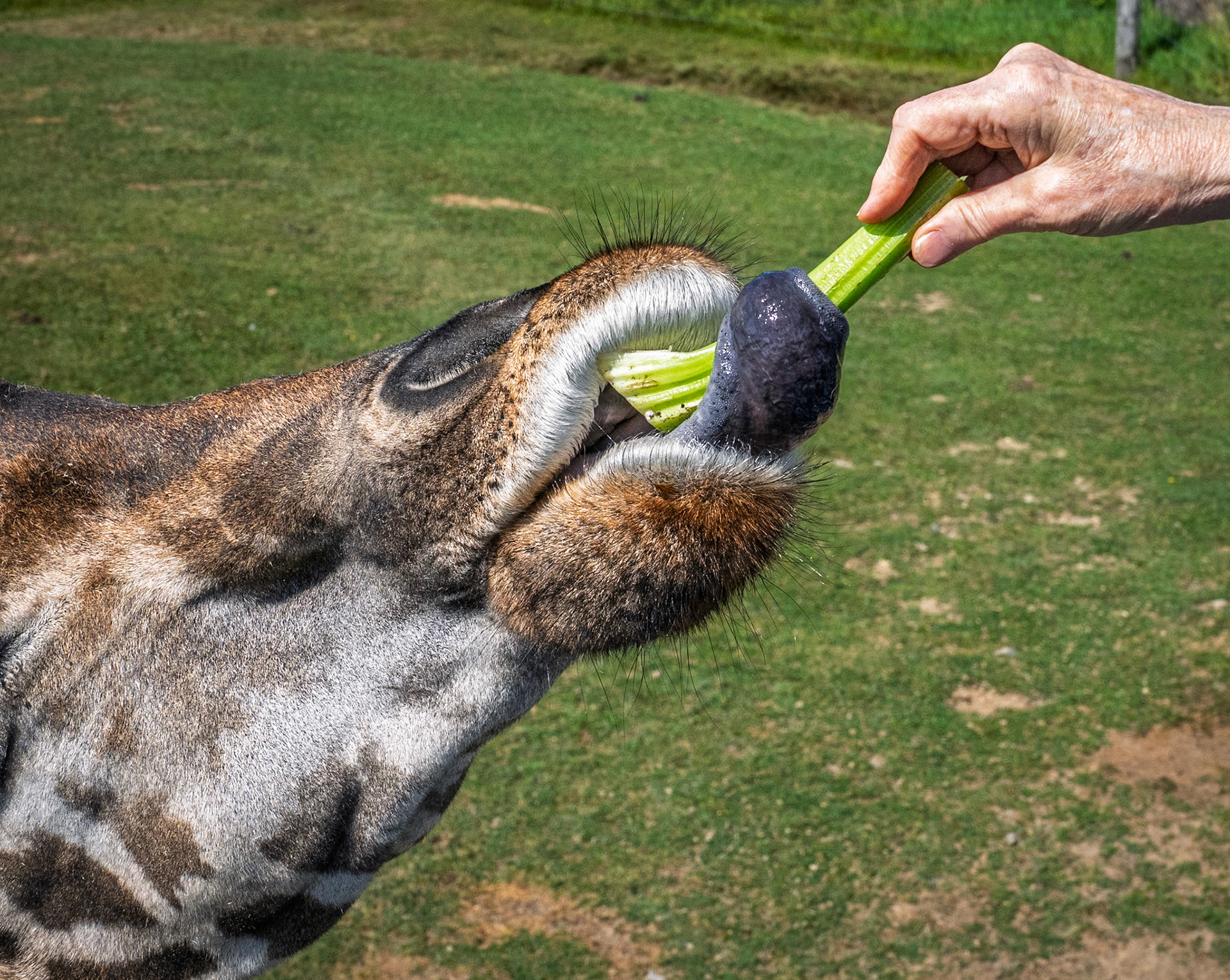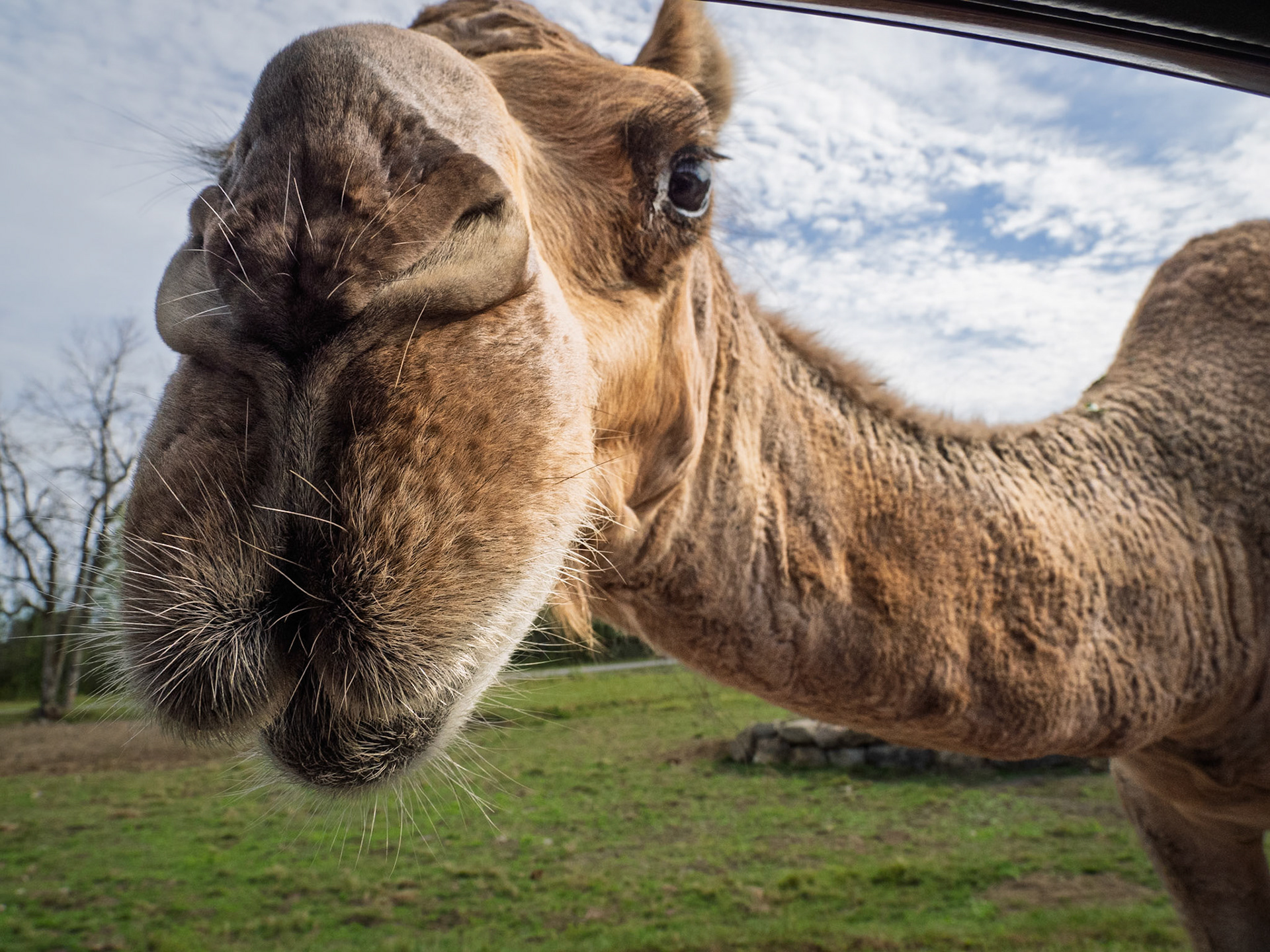 A camel about to put its head in the car hoping for some food, a giraffe wraps its long tongue around a celery stick