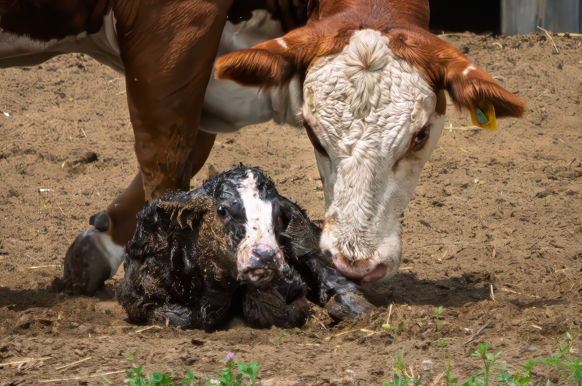 Left: What happens to a Texas longhorn cattle's horn when it gets frostbitten. Right: A 1-2 hour old calf being attended to by mum