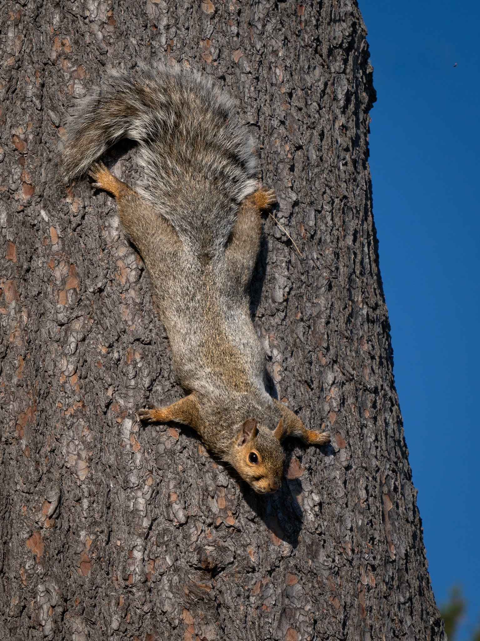 A grey squirrel, having finished a hand out, ran up the tree, planted his hind legs, stretched out and then planted his front feet - and stayed there sunbathing