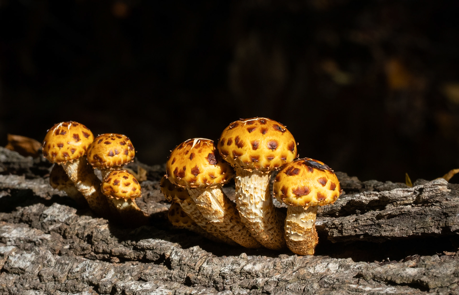 Golden Pholiota mushrooms on a fallen tree trunk (One of several such groups)