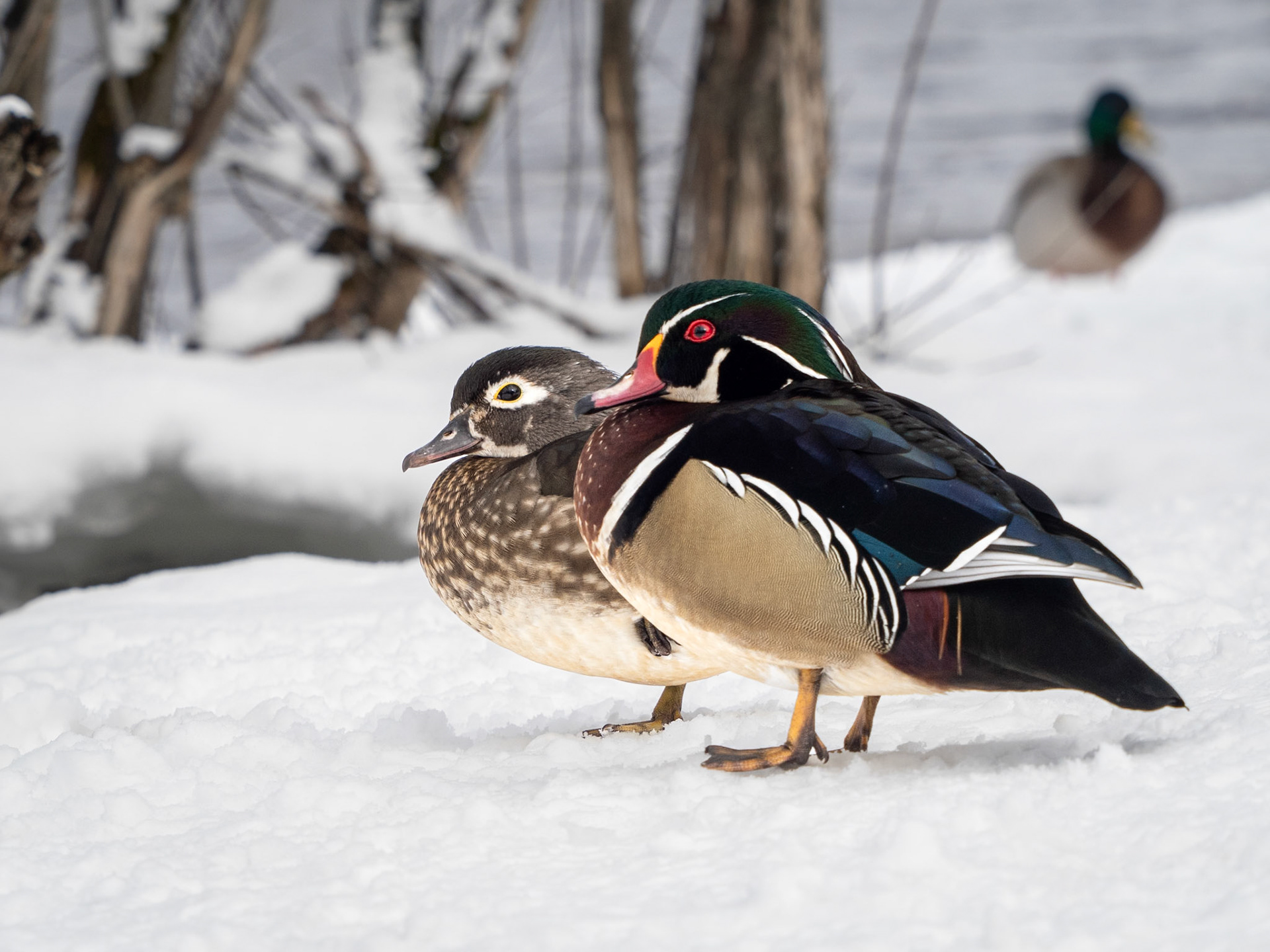 Cardinals are a standout at anytime, but a bright red one against the white snow really catches your eye. Wood ducks usually leave before the snow in the fall and return when the small lakes are free of ice in the spring. A pair of wood ducks arrived early and really stood out amongst all the mallards.